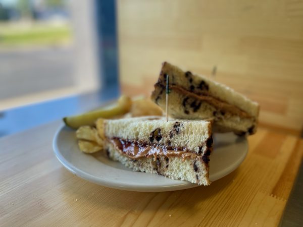 Served on chocolate chip bread with peanut butter and strawberry jam