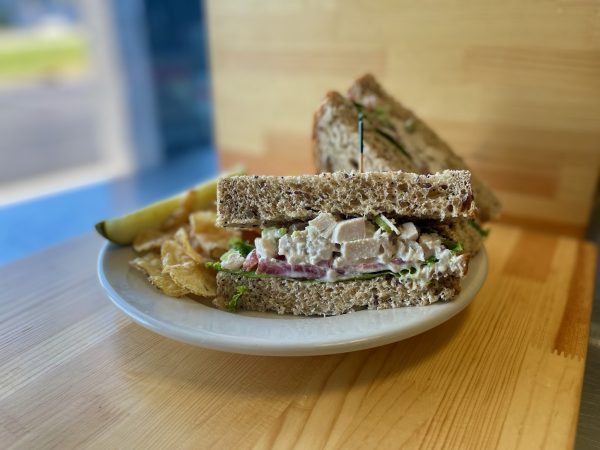 Diced chicken breast with celery, scallions, sesame seeds, mayonnaise, and seasonings served on 5-Seed Grain Bread with lettuce and tomato